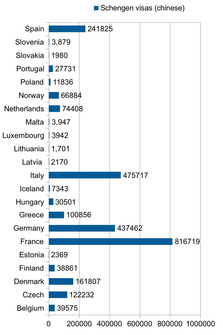 Chinese received 2.8 million schengen visas in 2018 with increase of 11% compared to previous year. French consulates in china granting over 800,000 visas to chinese citizens,