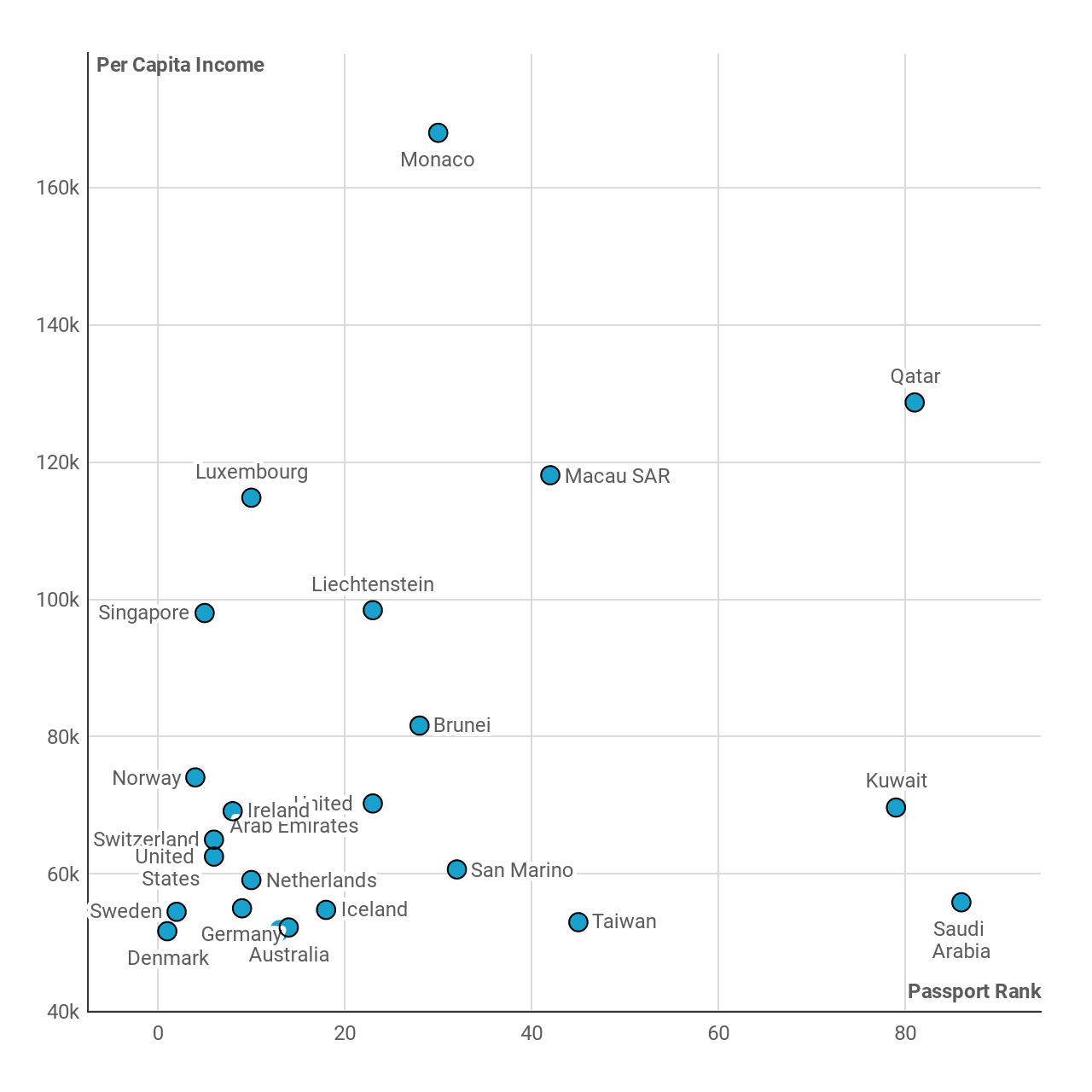 | Country | Per Capita Income | Passport Rank |